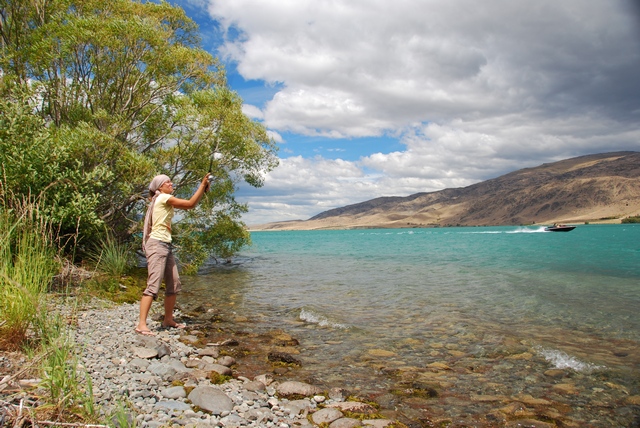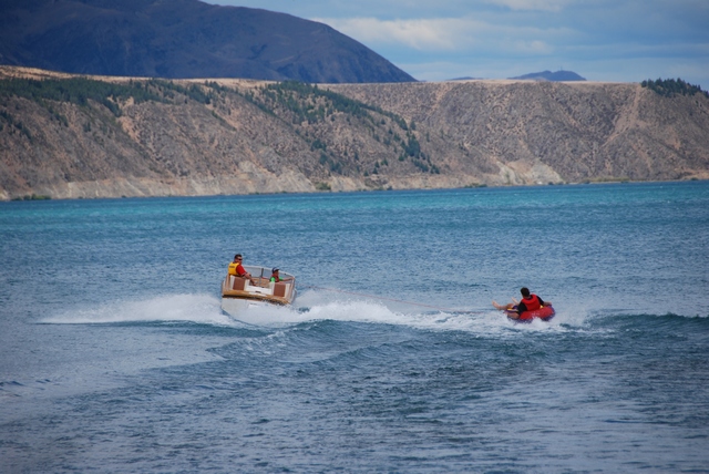Lub zasadzamy się na wieeelką rybę, która jednak najwyraźniej przestraszyła się silników. Tak się bowiem złożyło, że trwają najważniejsze nowozelandzkie wakacje, wobec czego kto żyw wydobył z garażu swoją oldskulową przyczepę Zephyr, zapakował motorówkę i wszystko, co da się za motorówką pociągnąć i dawaj! lansować się tłumnie na jeziorku…