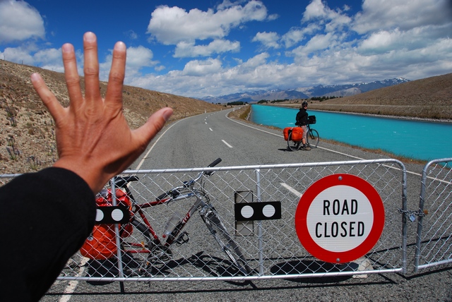 Im dalej na zachód, tym piękniej. Niestety, wiatr się na nas gniewa i wieje prosto w gębę. Nic to, pedałujemy zawzięcie wzdłuż wściekle turkusowego kanałku. Droga zamknięta, więc nie ma samochodów. Chociaż trzeba uczciwie przyznać, że kiwikierowcy traktują rowerzystów bardzo tolerancyjnie: zwalniają i omijają wielkim łukiem, pozdrawiają: im tobie gorzej, czyli im bardziej stroma górka, silniejszy wiatr i mocniejszy deszcz, tym większe serdeczności.