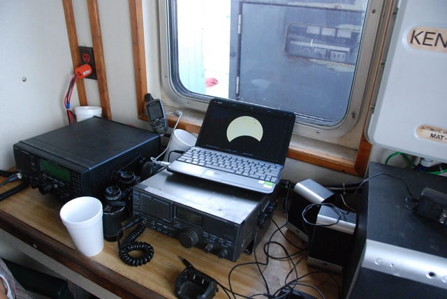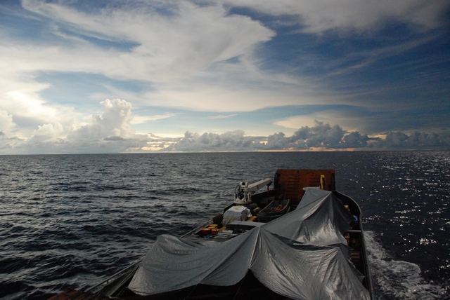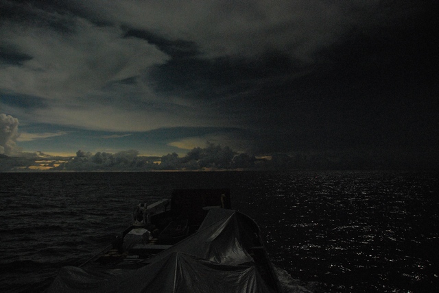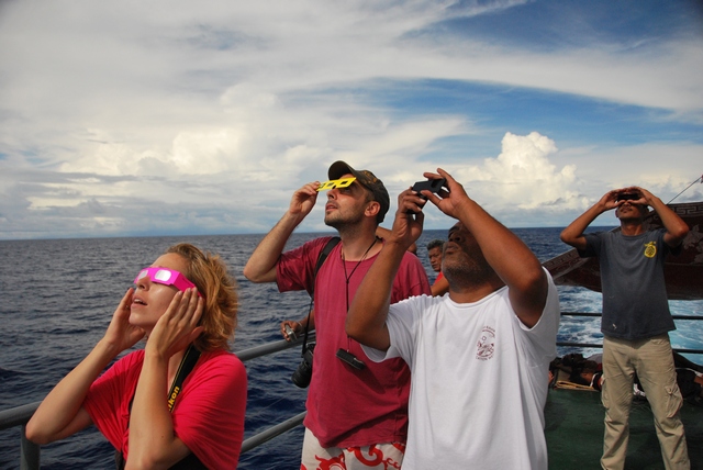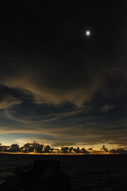 Powoli przygotowujemy się do zaćmienia, które ma nastąpić za trzy godziny. Nagle puka do nas pan: statek odpływa! A to się chłopaki pospieszyli! Kombinujemy, co robić. Jeśli zostaniemy, utkniemy na Kili. Jeśli popłyniemy, to jest ryzyko, że wyjdziemy za pas zaćmienia. Robimy szybkie kalkulacje: prędkość i kierunek statku…Wychodzi jednak, że nie powinniśmy wypłynąć z pasa przed zaćmieniem. Wracamy na statek. Tym bardziej, że nad Kili gromadzą się chmury.