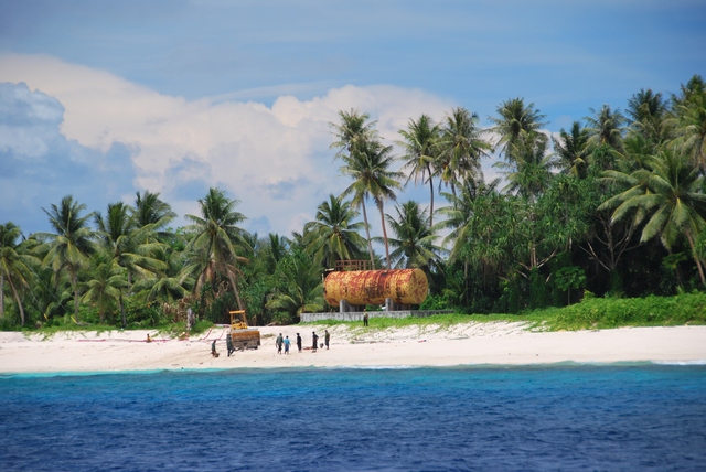 Następnego dnia śpimy długo. Robimy spacer po wyspie. Miejsce niezbyt przyjemne. Całe Kili wypełnione jest identycznymi, ciasno upchniętymi domkami przesiedleńców. Podobno żyją z nieustającej pomocy amerykańskiej, za nic nie muszą płacić, dostali nawet darmowy internet w każdym domku…Z drugiej strony trochę ropokurczaka i domków z tektury to mikroułamek budżetu prób jądrowych.